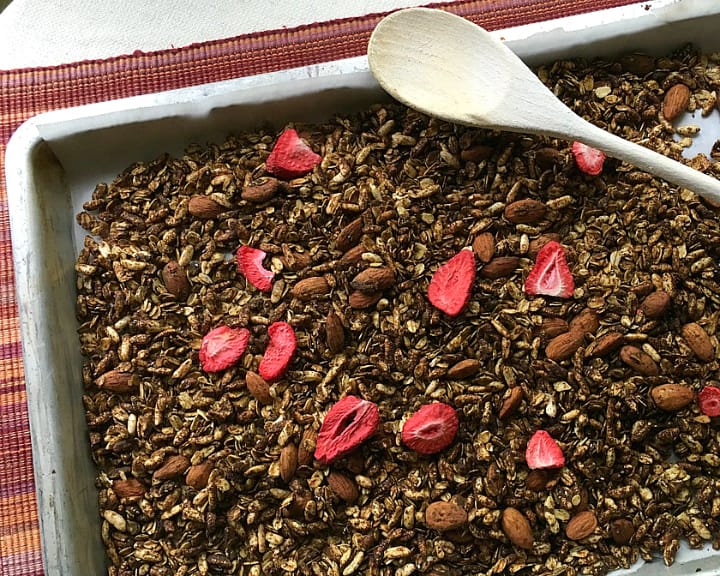 How about some yogurt and granola? True, most non-dairy yogurts are made with a lot of extra sugar. However, Silk makes a plain soy yogurt with 11 grams of protein per serving. Add some fresh or frozen berries and low sugar granola on top and you’re good to go! If you prefer coconut or almond yogurt try a protein granola on top for a protein boost.  You can buy some pre-made or you can also make your own, like the Strawberry Matcha Granola,  from the Protein Ninja cookbook on the weekend while you make those protein pancakes. You can also try the crunchy TopBit protein food topping. It is vegan and packs 10 grams of protein per serving.