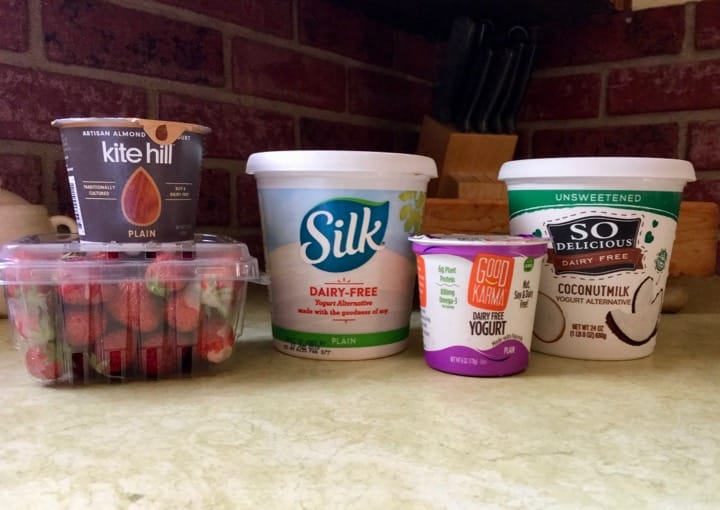 I am kicking off a month of quick and easy vegan foods with some delicious non-dairy yogurt brands. Based on clients’ suggestions and my own taste testing, I’m going to share the most satisfying non-dairy yogurt brands to eat with your strawberries, add to a smoothie or to make overnight oats.