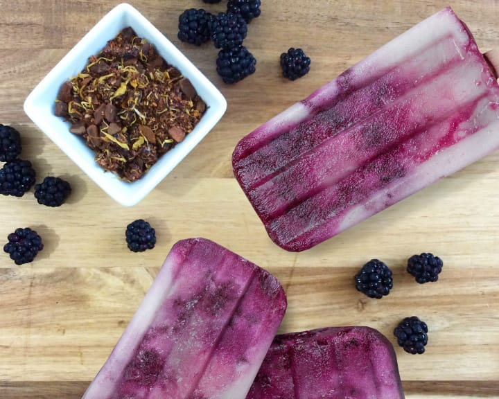 Based on their blueprint, I have two tea popsicle recipes for you to try. My favorite of the two recipes (and the one we sample in this video) is the Carefree herbal blend with some raw sugar poured into mold with a few fresh blueberries added in for an additional pop of flavor.