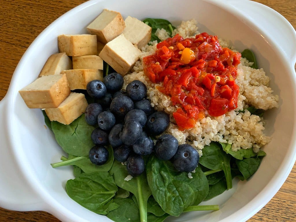 I started with baby spinach. Then I layered on the quinoa followed by the mango & roasted red pepper mixture. One the side I added baked tofu and blueberries. I bought this baked tofu ready to eat, but I could also use the roasted tofu I make and keep on hand. This meal took me less than 3 minutes to put together.