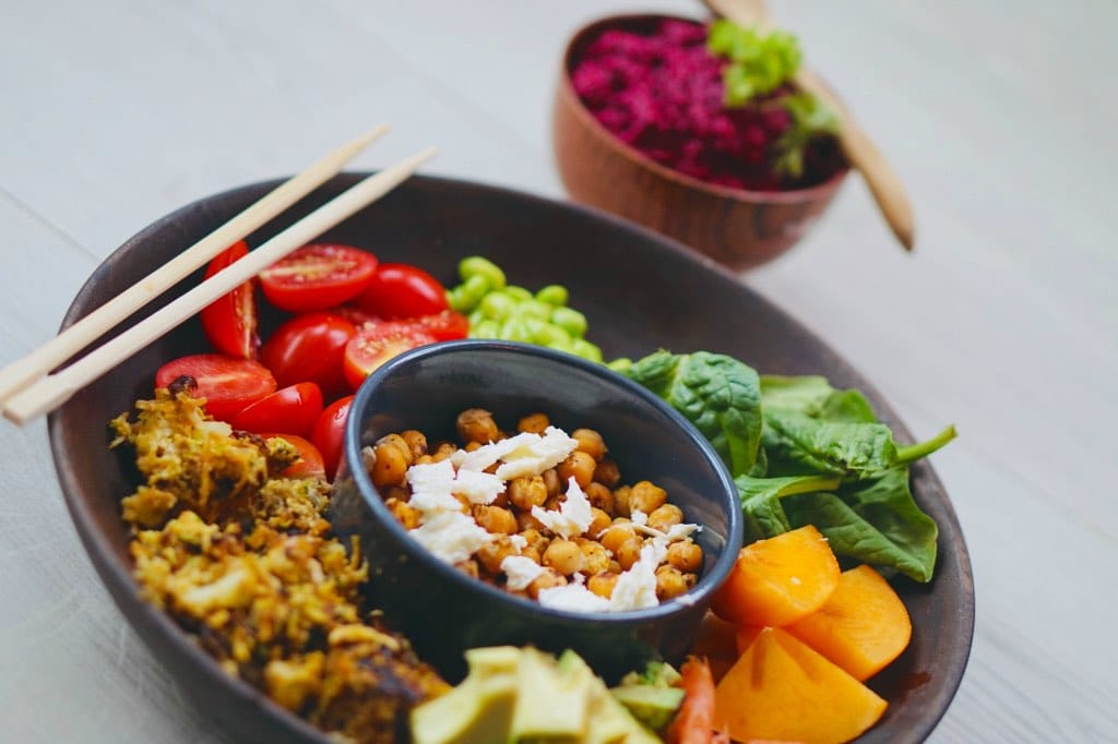 …a vegetarian meal, served on a single bowl or high-rimmed plate, which consists of small portions of several foods, served cold. These may include whole grains such as quinoa or brown rice, plant proteins such as chickpeas or tofu. and vegetables.